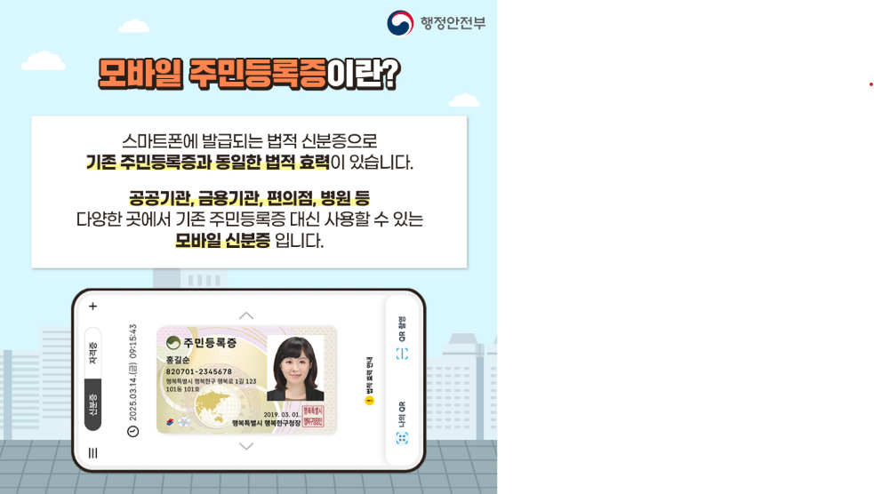 모바일 주민등록증은 2025년 1월부터 전국적으로 시행되고 있으며, 만 17세 이상 주민등록증 발급 대상자라면 누구나 신청할 수 있습니다. 특히 기존 실물 주민등록증을 이미 발급받은 사람도 모바일 형태로 추가 신청이 가능합니다.